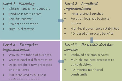 - Lack of a supporting architecture. Reaching the higher levels of Decision Management adoption requires an application architecture that supports decision service re-use across business processes. Development of the architecture foundation should be coordinated ahead of Decision Management adoption progression.