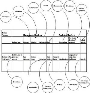 Organization documenting processes and decisions complete a planning matrix such as the figure below. Processes are comprised of process participants, activities, and flow control and process data. Where flow control branches, or decides with the data, business rules should are defined. Business rules formalize a decision, or flow control point in the process.