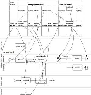 Many thought leaders in business and technology believe Business Process Management (BPM) and Business Rules (Decision Management) is critical to achieving business agility. Business agility is not the immediate result of BPM and Business Rules. Business agility happens once core processes and decisions achieve a certain maturity. That is: they are documented and understood, institutionalized throughout the firm and added to the enterprise architecture. Then, processes can be choreographed as components that are technology agile (process maturity level 4). BPM/Rules is well suited to integrate statistical analysis of data into enterprise decision management. Many ‘technical’ agility tactics work by ‘tweaking’ the decision factors of the choreography with these statistics. For instance, a firm might aim subtle shifts in behavior according to an analysis of past performance: information decisions and outcome. Other, less diaphanous, tactics might require rewriting business rules that control a decision point in a process. Business agility uses these technically agile capabilities to achieve performance acceleration in a business area.