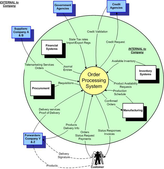 The Context Diagram graphically depicts the information flows between the current process, product, system or application and necessary internal and external vendor systems in the target environment. This model originated from the classic structured analysis work done in the late 1970’s by Tom DeMarco and Ed Yourdon. In addition to providing a better understanding of the existing environment, this model can assist in: