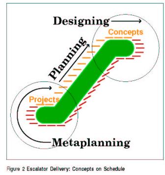Projects are initiated at a frequency that matches the frequency at which new concepts are desired. Whatever the planning time allocated, once the first project is completed, succeeding projects follow at the desired delivery frequency. The escalator is as long as the planning process; steps (projects) are as close together as the desired frequency of completion. Given a sound planning process, escalator delivery practically guarantees reliable, high-quality concepts at a predictable rate of appearance.