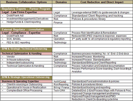 Here are some of the strategic options for larger financial organizations to help incorporate regulatory changes in coming year. These options are geared for companies to start planning for organizational transformation, reducing overall cost of regulatory implementation. The traditional outsourcing model does not involve legal liability of service providers for legal wrongdoing by their enterprise customers.